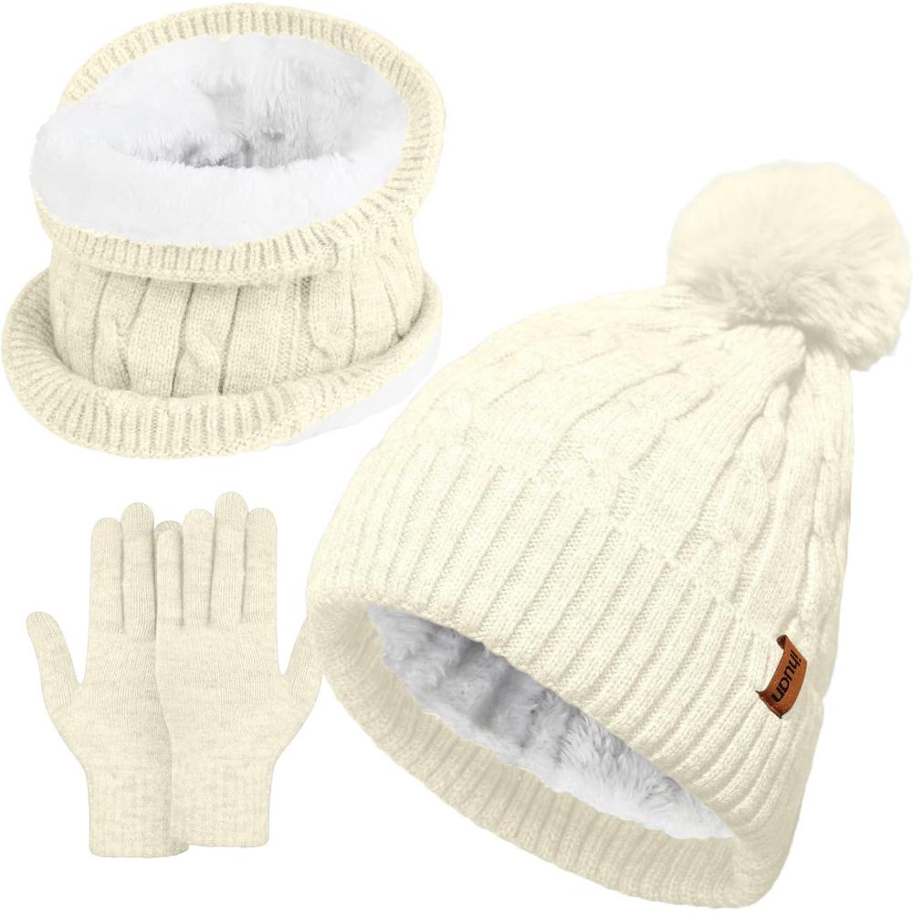 ihuan Winter Hat Scarf Gloves Warmer, Warm Knit Beanie Hat Touch Screen Gloves Set Neck Scarves for Women(Off-white)
